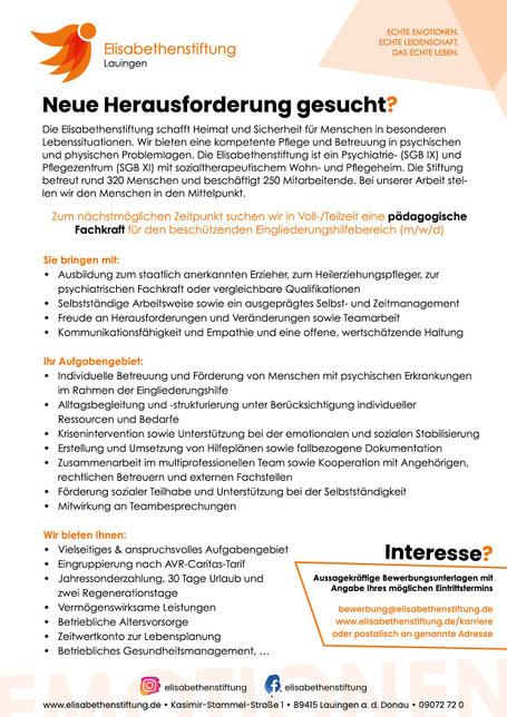 Wir bieten zum nächstmöglichen Zeitpunkt eine Stelle im Tätigkeitsfeld einer pädagogischen Fachkraft für den beschützenden Eingliederungshilfebereich an.